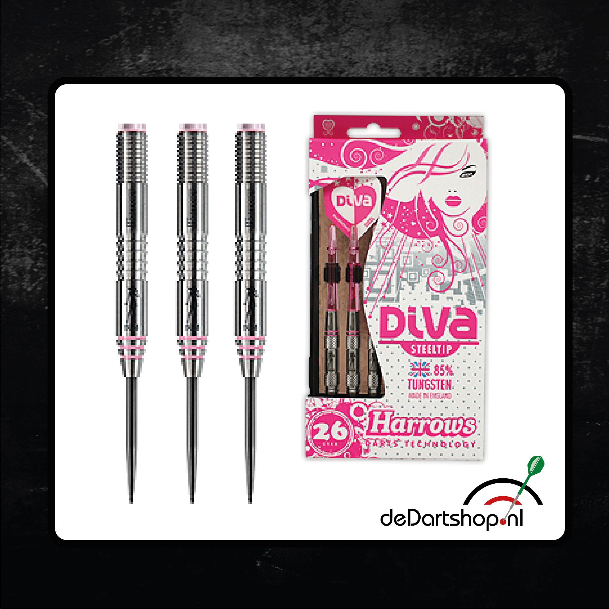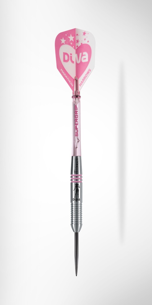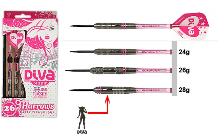 Super stijlvol en super strak. Diva 85% tungsten darts maken een leuk statement voor de stijlbewuste speler. De high-tech barrels zijn voorzien van een unieke laser gravering als een herinnering aan Harrows dartsprecisietechnologie. Kleurgecodeerde barrels, shafts en flights zijn een super chique aanvulling in de ine-up! Als vrouwelijke spelers liever zwaardere darts gebruiken dan is de keuze te maken in 24gr - 26gr en 28gr. Shaft: Supergrip - Flight: Diva.